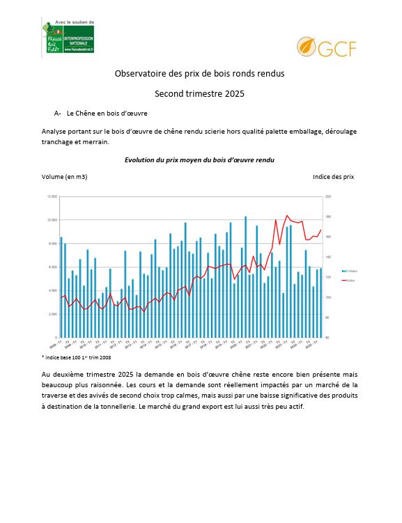 Evolution des prix de bois ronds rendus – France Bois Forêt et GCF – 2ème trimestre 2025