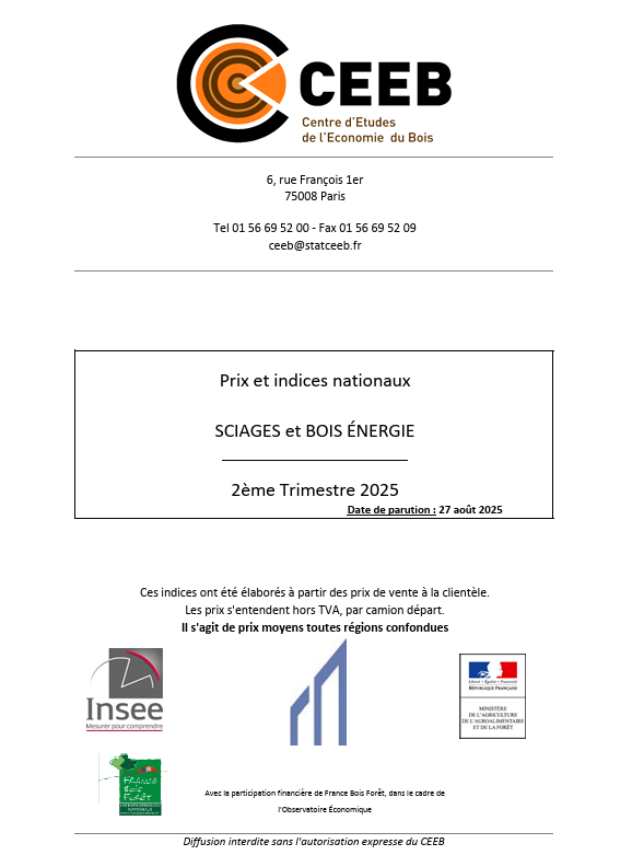 La mercuriale des prix et des indices nationaux sur les produits de sciages et de bois énergie du 2ème trimestre 2025 a été publiée en septembre 2025 par le CEEB.